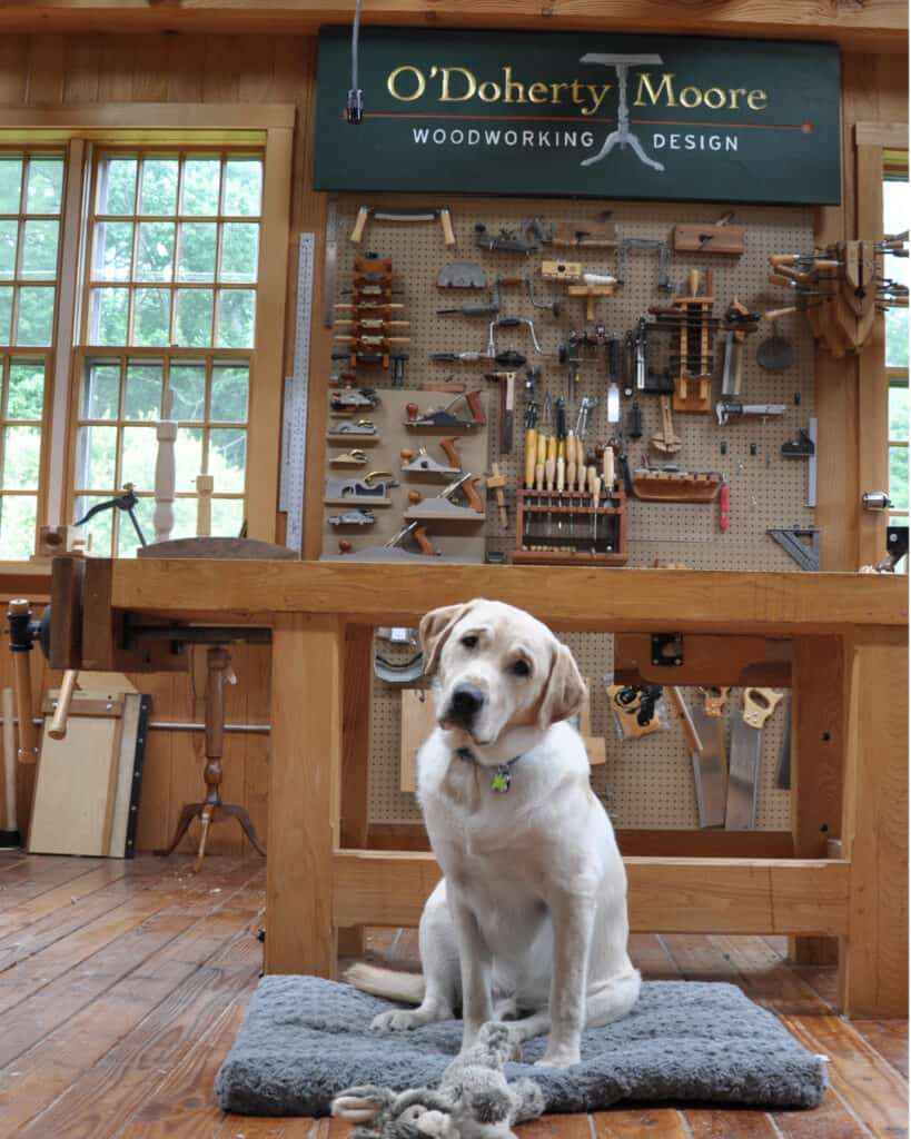 Buzz is a very good boy — he’s well tempered and leaves the wood alone in the workshop. However, he’s been known to chase Oak, Maple and Lucky, the three barn cats who live on the property, too.